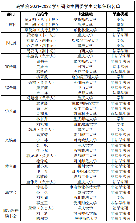 公司研究生团委员工会纳新工作已基本结束,现公示《金沙js55882021-2022学年研究生团委员工会拟任职名单》,公示期三天(9月6日—8日)。