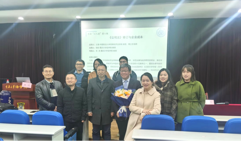 2023年12月15日,金沙js5588专题讲座系列之“私法三人谈”(第八期)在B区210学术报告厅举行。本次会谈以“《公司法》修订与企业成本”为主题,由中国政法大学民商经济金沙js5588王涌教授担任主讲人,金沙js5588张舫教授作为主持人,朱涛教授作为与谈人,王莉副教授、谢潇副教授、自正法副教授、谭津龙博士、蒋平博士、周莉欣博士、雍晨博士及百余名员工参加了本次讲座。