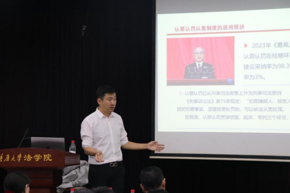 郭烁从刑事诉讼法的发展历程出发,深入分析了认罪认罚从宽制度的历史背景、对证据法实效化路径的影响、与正当程序、以审判为中心理念的联系、量刑建议刚性是否可取等几个方面的内容。他以“李凤贞盗窃案”等经典案例引导在场同学思考认罪认罚从宽司法适用的难题,风趣幽默的授课方式赢得了在场师生们的阵阵掌声。郭烁对同学们寄以较高的期望,强调法科生一定要形成法律人的思维,掌握好法教义学、法解释学的方法,分析法律制度背后的法理。