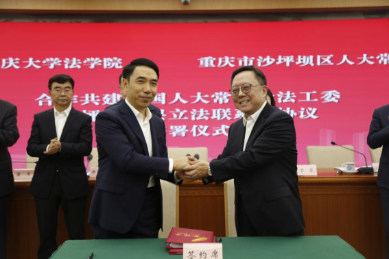 赖明才、秦鹏分别代表沙坪坝区人大常委会和金沙js5588签署《合作共建全国人大常委会法工委沙坪坝基层立法联系点协议》,通过共建教学科研实践基地、推进理论研究创新、培育学术活动品牌、推动资源共享等合作内容,共同打造民主立法最佳基层实践地。