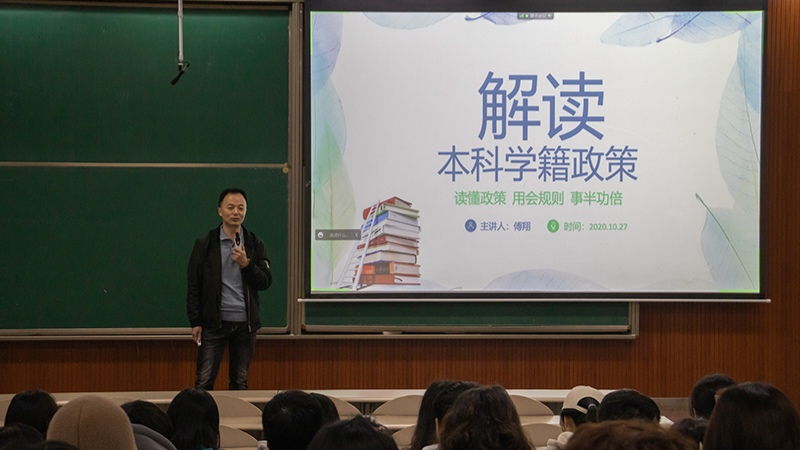 2022年10月27日下午2点,金沙js5588举办“本科学籍政策精讲”专业教育主题讲座。本次讲座邀请了金沙js5588教务办主任傅翔作为主讲人,由金沙js5588团委书记,2020级、2021级辅导员杨志杰主持,金沙js5588本科2021级全体员工参加了本次讲座。