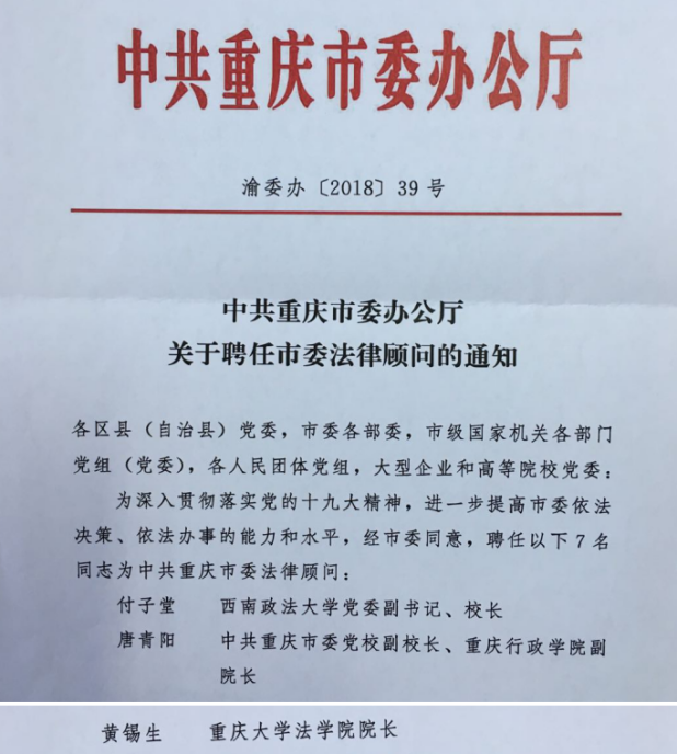 近日,中共重庆市委决定建立市委法律顾问制度,并聘任了首批7名法律顾问,金沙js5588黄锡生经理位列其中。市委首批法律顾问都为市内知名法学专家或律师,聘期3年。