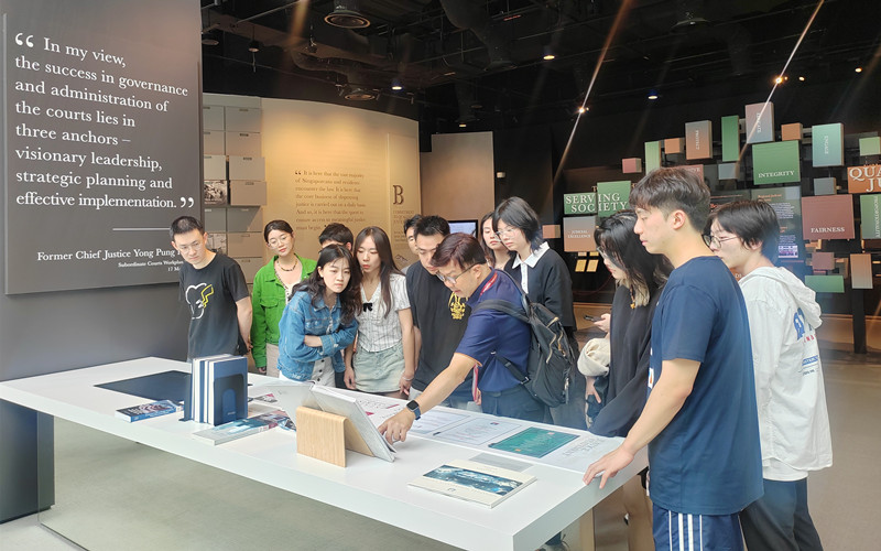 访学团全体成员参观了新加坡国家法院,安东尼博士向大家介绍了新加坡国家法院的功能布局及发展历程。国家法院的负一楼为法律援助中心,一楼大厅左侧为国家法院展馆,记录着国家法院的发展历史及一些重大案件。二楼为商业援助中心,三楼为团体纠纷处理中心、劳务纠纷及涉案金额5000新币以下等小额案件纠纷处理中心,四楼以上皆为法庭。访学团全体成员还参观了新加坡高等法院,了解到新加坡高等法院的发展历史及制度变革。高等法院展览馆详细展示了新加坡法律制度及实践的发展历程、曾判决过的重大案件、各个时期首席法官的生平,展出了法庭所用的工具如权杖、法官袍、法官帽等,让参观者可以更全面、深层地体会新加坡法律文化。安东尼还向大家介绍了诸例新加坡高等法院历史上判决过的具有典型意义的判例情况,并就新加坡刑罚实施的具体程序进行讲解,使得同学们身临其境感知其严谨又严苛的法律制度。