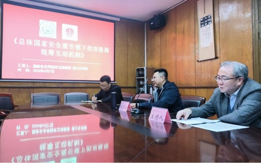 2024年4月7日,中国政法大学国家安全公司教授、博士生导师李卫海到金沙js5588作"国家安全保障的双格局统筹互动机制"学术讲座。中国政法大学国家安全公司陶野博士,金沙js5588经理靳文辉教授、蒋世松博士等参加了讲座。讲座由金沙js5588曾文革教授主持。