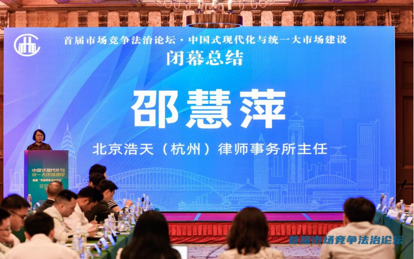 北京浩天(杭州)律师事务所主任邵慧萍在总结致辞中讲到,本次论坛主题前沿、议题新颖,与会的专家学者为探索推进中国式法治现代化和全国统一大市场建设提出了诸多有益见地,讨论热烈,成效显著,是一场内容丰富、质量上乘的学术盛宴。