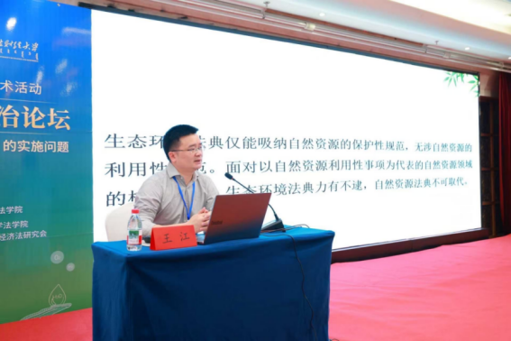 大会主题报告环节由黄锡生主持。胡德胜、王江分别作《自然资源权利的权利属性问题》《中国自然资源法典编纂论纲》主题报告。