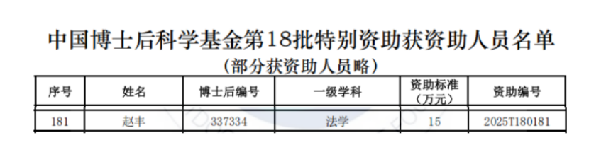7月7日,全国博士后管委会办公室、中国博士后科学基金会发布了《关于公布2025年度中国博士后科学基金第18批特别资助获资助人员名单的通知》,法公司弘深青年教师赵丰博士申报的项目获得立项。中国博士后科学基金是国家专门为在站博士后研究人员设立的科研基金,旨在促进具有发展潜力和创新能力的优秀博士后研究人员在站期间开展创新研究,培养造就一支高层次创新型博士后人才队伍。