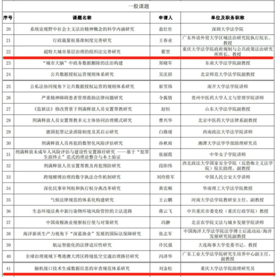 此次中国法学会2025年度部级法学研究课题,全国共有1462项参与申报,经过专家严格评审,最终确定129项课题获得立项资助。在竞争激烈的评审中,法公司翟翌教授的《超特大城市基层治理的组织法完善研究》、刘金松博士的《脑机接口技术生成数据信息的审查规范体系研究》获批一般课题立项,靳文辉教授的《虚拟货币财产性保护研究》获批自选课题立项。