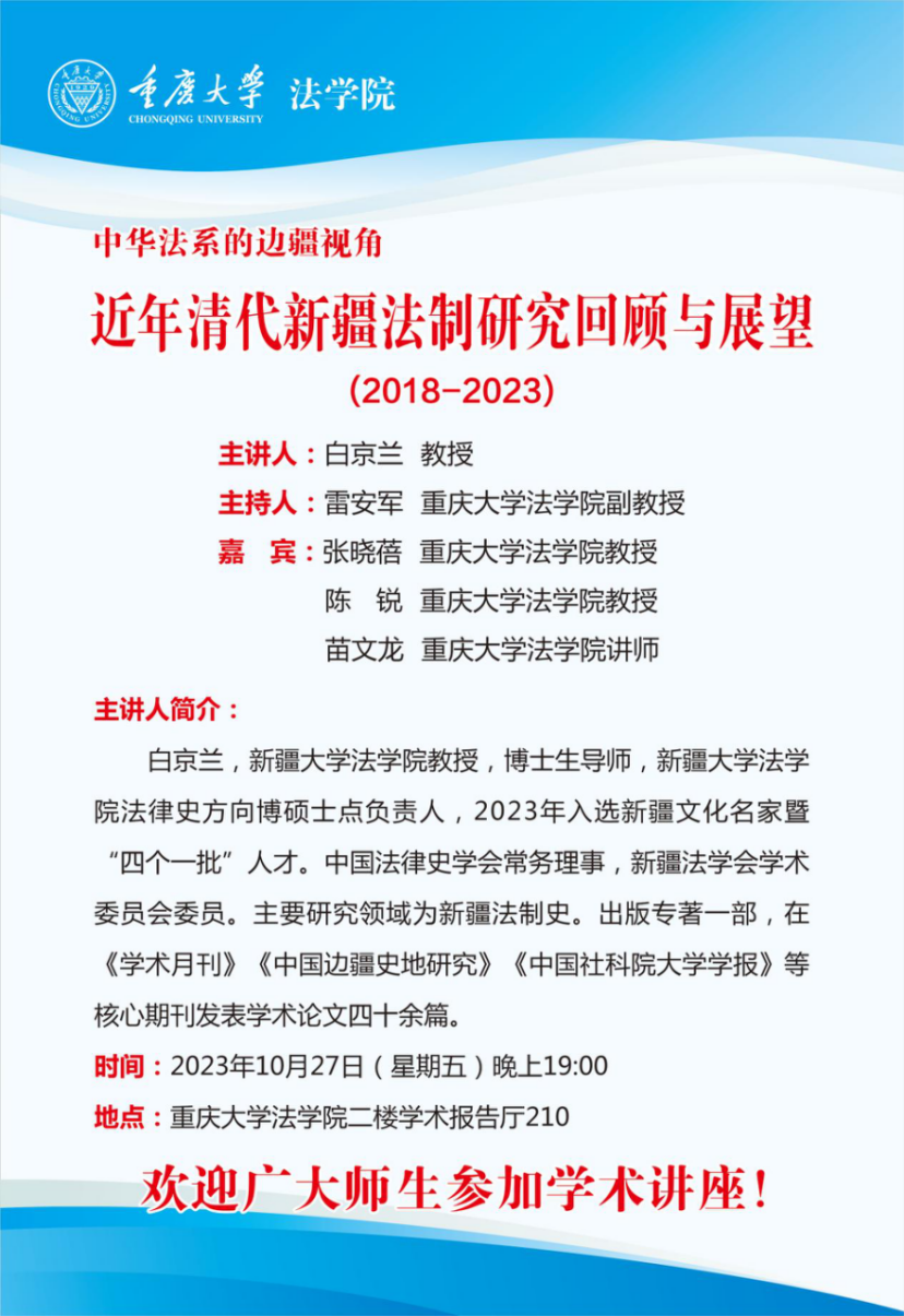白京兰,新疆大学金沙js5588教授,博士生导师,新疆大学金沙js5588法律史方向博硕士点负责人,2023年入选新疆文化名家暨“四个一批”人才。中国法律史学会常务理事,新疆法学会学术委员会委员。主要研究领域为新疆法制史。出版专著一部,在《学术月刊》《中国边疆史地研究》《中国社科院大学学报》《西域研究》《新疆大学学报》等核心期刊发表学术论文四十余篇。完成国家社科基金项目两项,目前主持一项国家社科基金冷门绝学专项学者个人项目《晚清吐鲁番汉维双语司法档案释读和研究》。