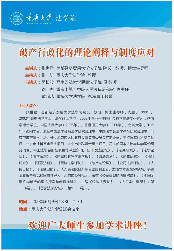 主讲人介绍:张世君,首都经济贸易大学金沙js5588经理、教授、博士生导师,先后于1999年、2002年获得法学学士、法学硕士学位,2005年毕业于中国社会科公司法学研究所,获法学博士学位。中国人民大学(2008年)、香港理工大学(2011年)、台湾大学(2015年)访问学者。兼任中国法学会商法学研究会理事,中国法学会法学教育研究会理事,北京市破产法学会副会长,北京市人民政府立法专家委员会专家委员。主持国家社科基金项目,北京市社科基金重大项目、北京市社科基金重点项目、司法部国家法治与法学理论研究项目、中国法学会部级项目等课题多项。在《政法论坛》、《法商研究》、《法学论坛》、《法学杂志》、《国家检察官公司学报》、《政法论丛》、《财政研究》、《税务研究》、《证券法苑》、《经济法学评论》、《破产法论坛》、《公司法律评论》、《人民日报》、《法制日报》、《人民法院报》等专业期刊上公开发表学术论文50多篇。多篇资政报告获党和国家领导人、北京市领导批示。著有《公司重整的法律构造》、《中国金融机构破产的理论探索与制度构建》,主编《经济法要论》、《法律家讲演录》(第1—4卷)、《首都法学论坛》(第9—13卷)。