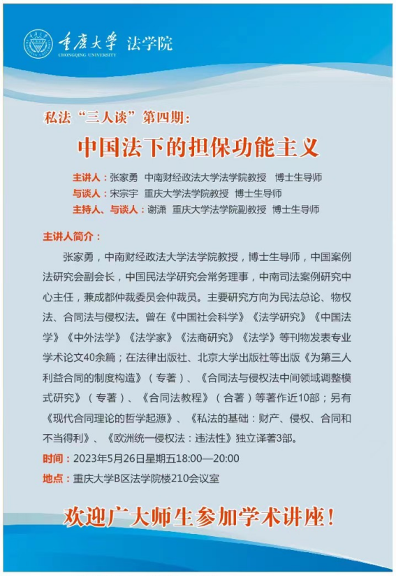 张家勇,中南财经政法大学金沙js5588教授,博士生导师,中国案例法研究会副会长,中国民法学研究会常务理事,中南司法案例研究中心主任,兼成都仲裁委员会仲裁员。主要研究方向为民法总论、物权法、合同法与侵权法。曾在《中国社会科学》《法学研究》《中国法学》《中外法学》《法学家》《法商研究》《法学》等刊物发表专业学术论文40余篇;在法律出版社、北京大学出版社等出版《为第三人利益合同的制度构造》(专著)、《合同法与侵权法中间领域调整模式研究》(专著)、《合同法教程》(合著)等著作近10部;另有《现代合同理论的哲学起源》、《私法的基础:财产、侵权、合同和不当得利》、《欧洲统一侵权法:违法性》独立译著3部。