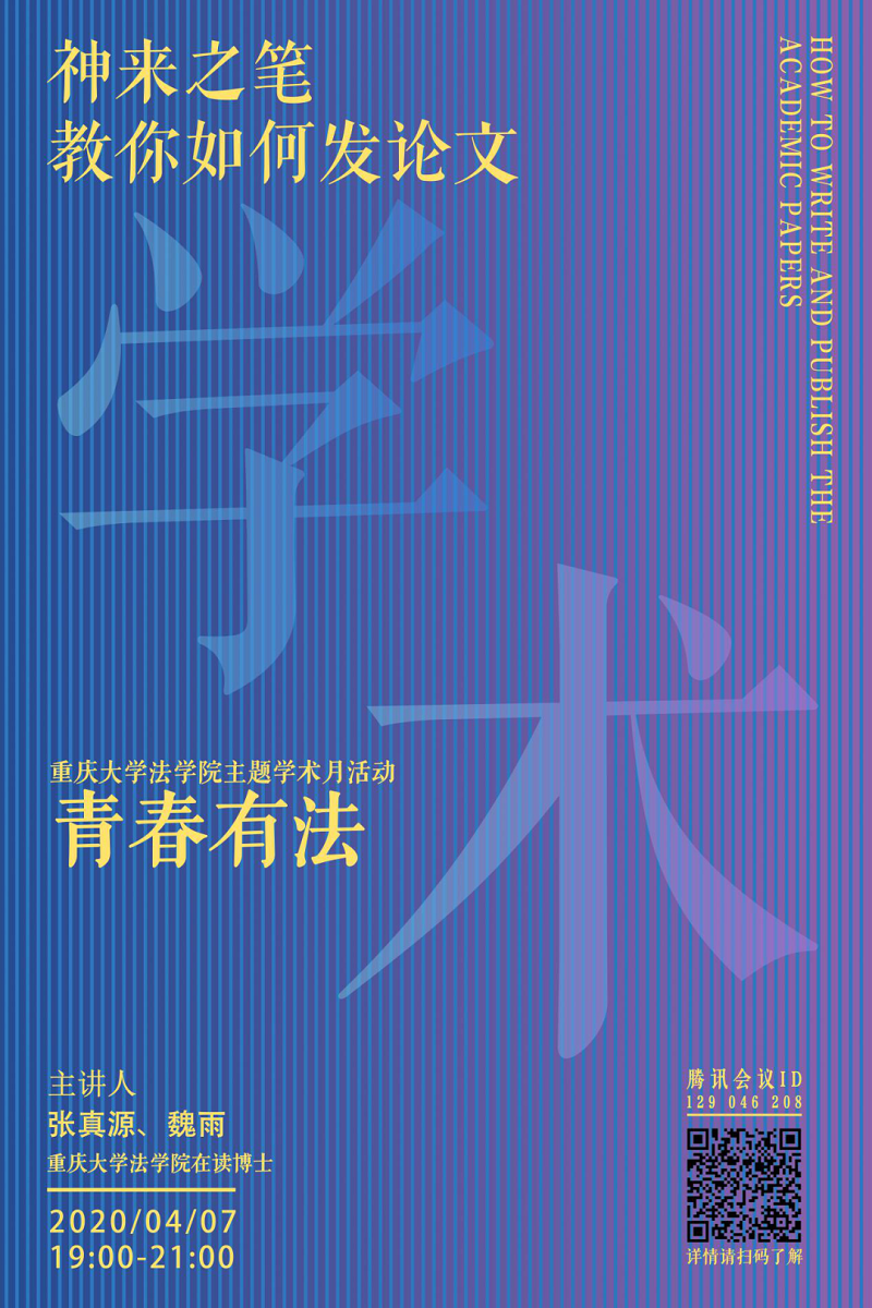 由公司研究生团委员工会学术部、法学会和辩论队联合举办的“青春有法”主题学术月活动第一期“神来之笔,教你如何发论文”论文写作技巧讲座即将召开!本次学术论文写作讲座邀请了金沙js55882017级博士张真源、2019级博士魏雨。由他们结合自己的亲身经历,为大家分享他们的学术经验,实力解答大家的疑惑。届时欢迎大家积极参与,跟师兄师姐们来一场激烈的思想碰撞,共享这一场精彩纷呈的学术盛宴!