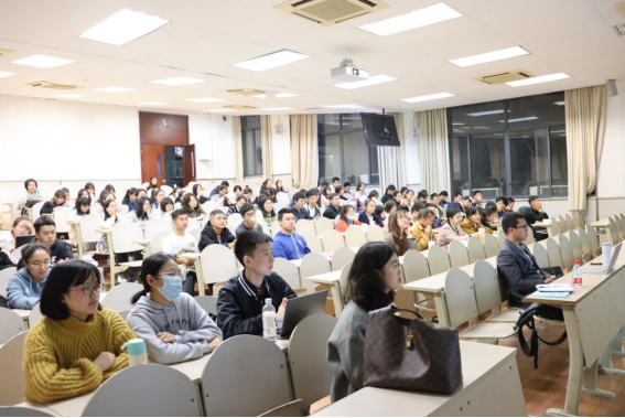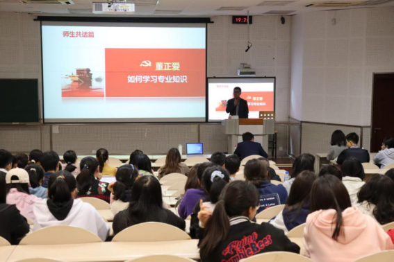 讲座伊始,自正法老师首先为大家一一介绍了各位到场嘉宾,然后又以幽默诙谐的口吻为大家点明了本次班导会的要旨与目的,并从自身角度出发对读书学习、生活社交向同学们分享了经验,并且嘱托同学在着重学习之余更要重视身体和心理健康,表达了对新生们的诚挚关爱与殷切希望。