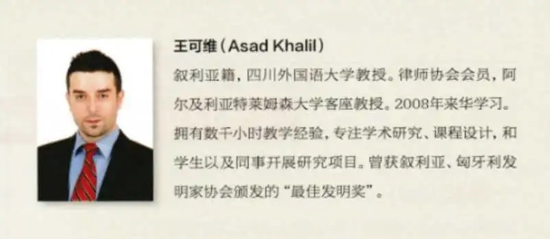 Asad Khalil教授是宪法学,商业,教育,管理学专家,现任四川外国语大学教授职务,SISU教师培训发展中心培训讲师,重庆国际战略研究院(一带一路-中国领事馆和海外事务)主要成员,阿尔及利亚特莱姆森大学客座教授,联合国开发计划署。