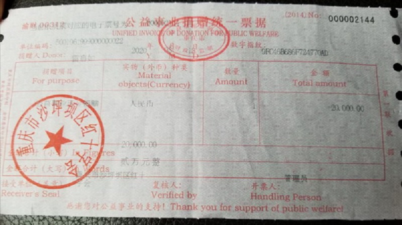 国难当前,方显责任担当。在广大共产党员,以及全社会都捐款捐物支持抗疫事业的紧要关头,作为律师的雷启如当仁不让,即使在业务严重受损的情况下,也积极捐款2万元。