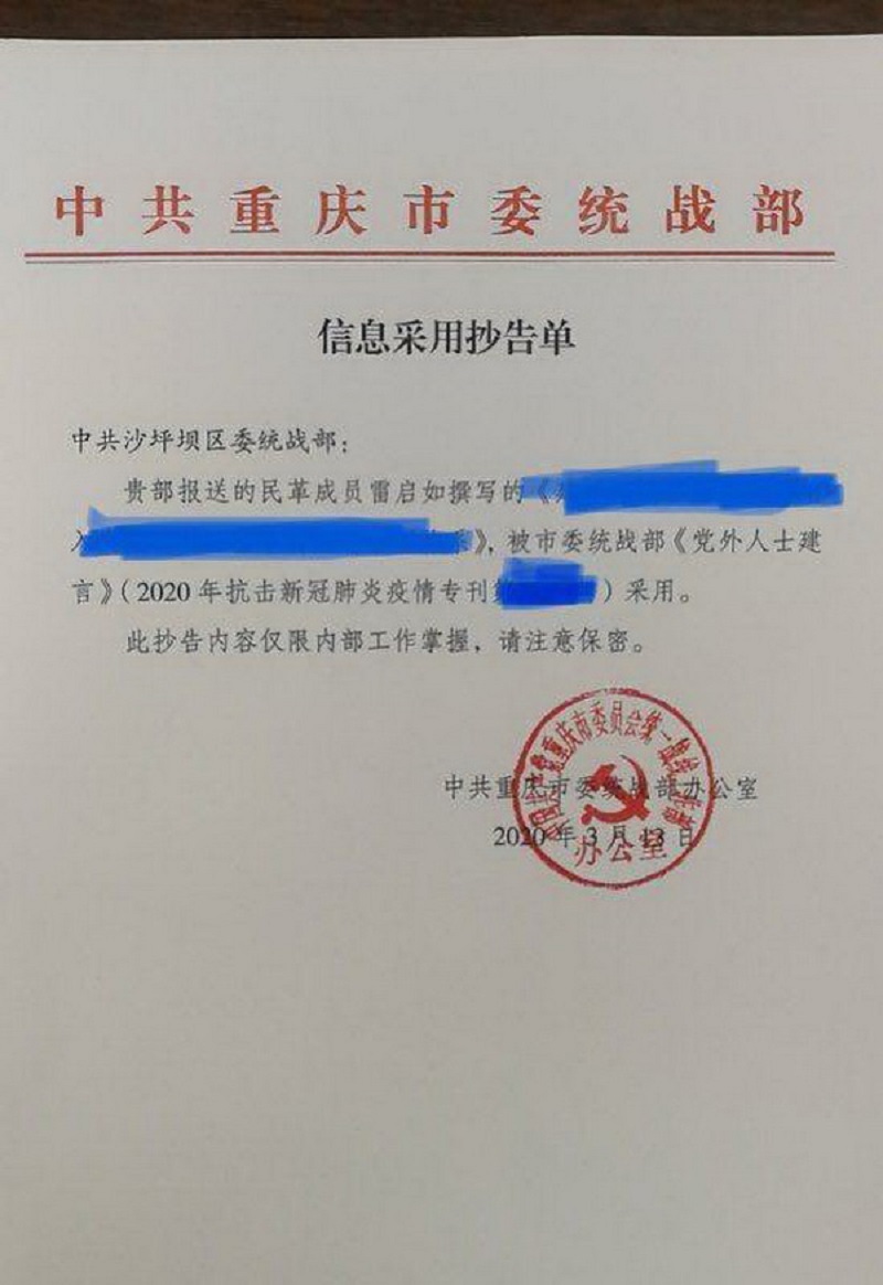 说干就干,雷启如根据中央深改委第十三次会议精神信息点,结合自己的理性思考,很快写就了两篇有关抗击疫情建设性意见方面的文章,得到社会各方面的认同,其中一篇还得到重庆市委统战部的采纳。