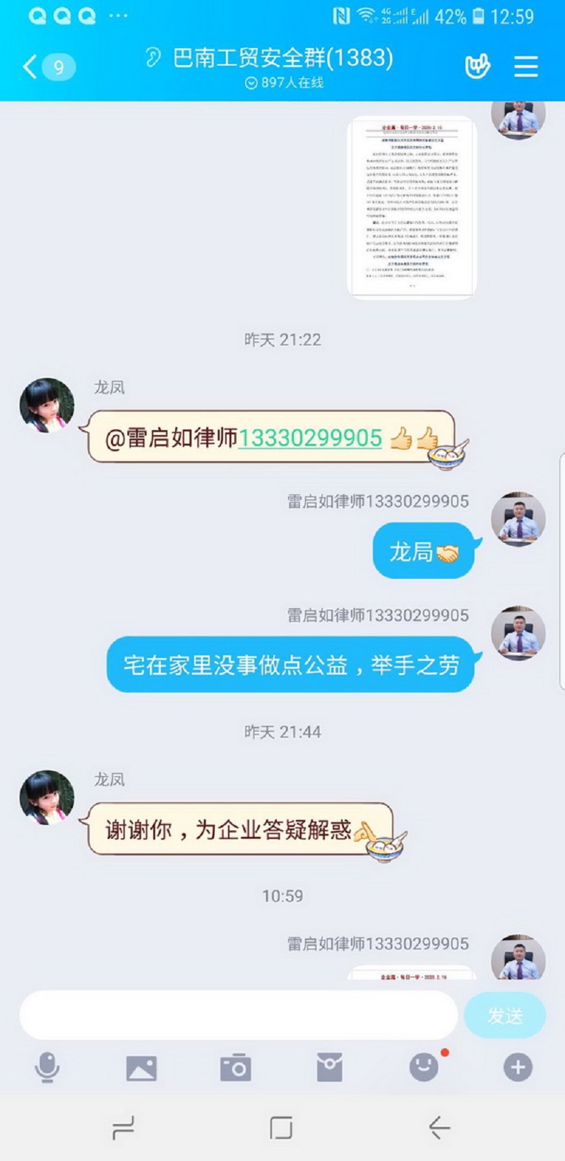 疫情期间,全民禁足。近两个月的时间里,雷启如的思想和脚步却始终没有停歇:运用法律知识向重庆市委统战建言两篇,被采纳一篇。为支援抗击疫情,捐款2万元。主动到抗疫一线,协助街道防疫检查,协助公安机关为企业复工复产提供法律咨询。参加三个抗疫法律援助团:沙坪坝区司法局组织“抗击疫情公益法律服务团”、沙坪坝区统战部“抗击疫情公益法律服务团”、巴南区统战部“挂职干部抗击疫情公益法律服务团。