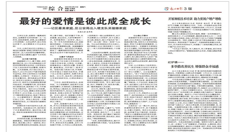 近日,永川日报以《最好的爱情是彼此成全成长》为题,报道了区公安局出入境管理支队吴骏雄家庭。作为双警夫妻,他们并肩作战、相互温暖,在平凡的岗位上书写着不平凡的人生华章。原文如下:
