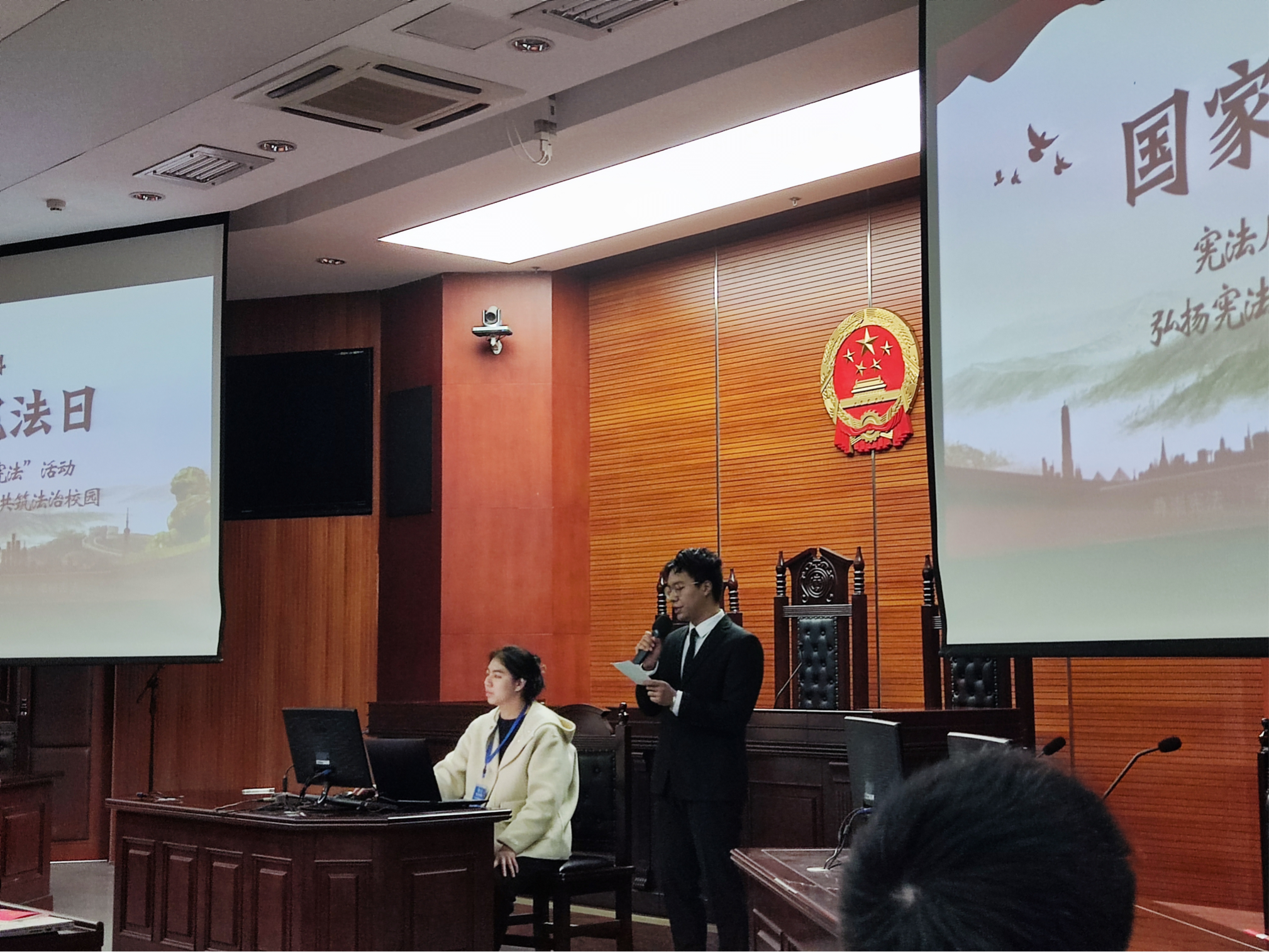 2023年12月4日上午九时,来自全校各个公司的150余名党员同志代表齐聚B区第二综合楼模拟法庭,通过网络直播的方式参加“宪法晨读”活动。本次“宪法晨读”活动由教育部全国教育普法领导小组办公室主办,活动主会场设立在北京。