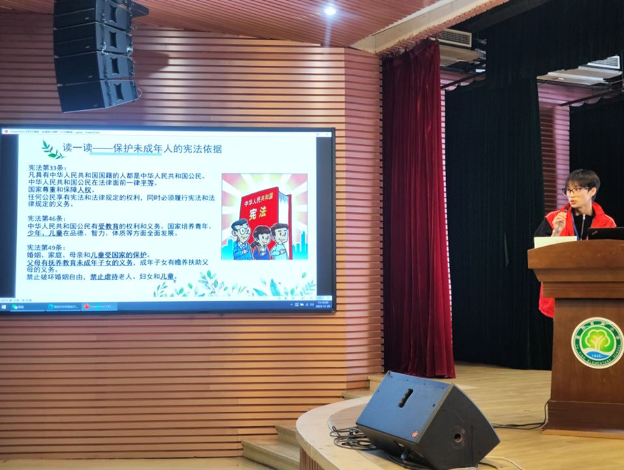 在“宪法月‘护苗’”环节,宣讲志愿者引导同学们朗读《宪法》中与未成年保护相关的法条。诵读结束后,志愿者用通俗易懂的语言向同学们解释了法条的内涵与意义。志愿者通过解释《宪法》在我国法律体系中的最高地位,使同学们了解到国家与社会对未年成人群体权利保护的高度重视。