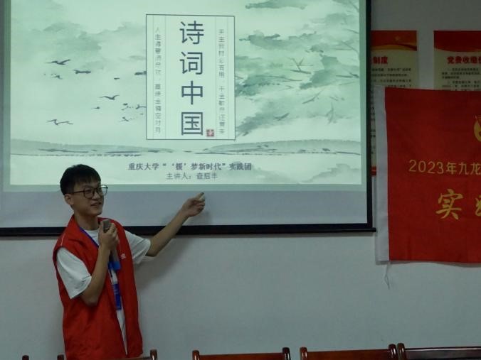 实践团成员查启丰首先围绕“诗词中的法治中国”进行了普法宣讲。他将中国传统诗词文化与宪法、民法和刑法等相关法律法规相结合,通过分享诗词之美,感受诗词之趣,引导少年儿童从古人的智慧和情怀中汲取文化营养,涵养法治精神,达到寓教于乐、寓学于趣的效果。