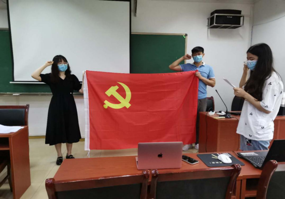 会议第一项议程是预备党员入党宣誓暨老党员重温誓词,由李颖同志和陈梓璇同志在线下横拉党旗,全体同学在视频中一同跟唱国际歌,然后宣读入党誓词,同学们都庄严肃穆地大声念着入党誓词,宣示着自己成为一名中国共产党员的坚定意志。