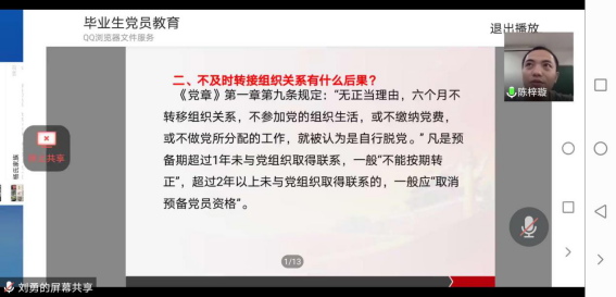 会议第二项议程由刘勇老师发言,为即将毕业的同学们祝福,他们或者走上工作岗位,或者继续深造学习,都会有属于自己的美好未来。紧接着,刘勇老师对毕业生党员转移党组织的工作流程进行讲解,明确及时进行组织关系转接和纸质档案转移工作的重要性,并明确表示因未及时转移党组织关系或者未按时参与党组织活动或者按时缴纳党费,产生预备党员无法转正和正式党员自行脱党的后果。
