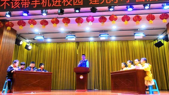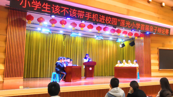 此次主题辩论赛是莲光小学首届亲子辩论赛,辩题为“小员工该不该带手机进校园”,来自莲光小学五年级的8位小辩手分成正反两方参加辩论。辩论赛分为立论、驳论、自由辩论、结辩四个环节,在主席宣读完比赛规则及注意事项后,辩论赛拉开帷幕。正方一辩刘俊豪开门见山,首先亮出“小员工应该带手机进校园”的观点,从手机可以实现家、校、生即时通讯、为学习和生活提供便利等角度阐述理由。反方一辩刘笑萱针锋相对,认为小员工不应该带手机进校园,指出小员工年龄低,心智不够成熟,将手机带入校园将会对其身心和学习生活产生非常大的负面影响。