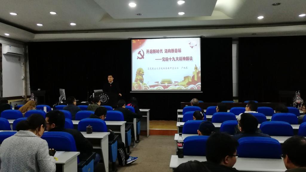 宣讲会以《开启新时代,迈向新目标——党的十九大精神解读》为题,从十九大召开的背景及概况、十九大报告的主要内容、十九大报告的地位和意义、习近平新时代中国特色社会主义思想等方面对党的十九大精神进行了讲解和解读。十九大的主题是“不忘初心,牢记使命,高举中国特色社会主义伟大旗帜,决胜全面建成小康社会,夺取新时代中国特色社会主义伟大胜利,为实现中华民族伟大复兴的中国梦不懈奋斗”,卢老师认为这个主题明确回答了党在新时代举什么旗、走什么路、以什么样精神状态、担负什么样的历史使命、实现什么样的奋斗目标的重大问题,这个主题有高度、有深度、有广度,立意高远、思想深邃,是我们学习贯彻落实十九大精神需要抓好的一个基本点。
