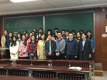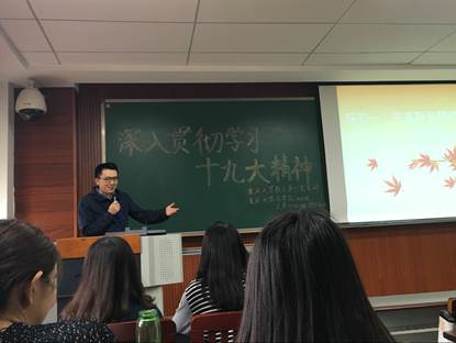 2017年11月16日下午3:00-5:00在虎溪校区D1350教室,金沙js5588理论法系教工支部与2016级1-2班团支部联合举办党团共学“十九大报告”主题活动。该活动由2016级1班团支书主持,理论法系教工支部5名党员和2016级1-2班团支部全体团员共同参加。
