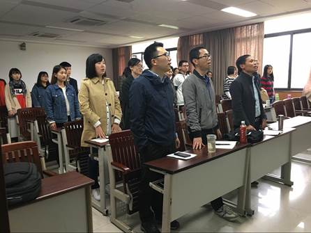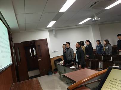 紧接着在理论法系教工支部书记朱俊同志的带领下,全体党员重温入党誓词,全体共青团团员学习中国共产党入党誓词。然后进行的是十九大报告知识竞赛,以教师党支部为一方阵,员工团支部为一方阵。接着,雷安军同志从历史角度阐释了他对于十九大报告的认识,朱俊同志从革命、后革命、行动、仪式、资源等角度解读了十九大报告的有关法治与革命的话语,刘东霞同志从法治的立场解读了十九大报告,王琳同志从实施的立场解读了十九大报告,2016级1、2班的同学们也从员工的角度谈了他们对于十九大报告的认识。
