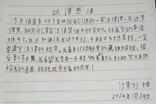 直播结束后,观看直播的青少年用纸笔写下自己的感想。来自西藏地区的曲松尼姆同学说道:“在学习法律的过程中,我们会了解到很多看似和我们日常生活相距甚远的内容,但事实上,这些法律规定了我们日常行为的边界,保障了我们的权益。”