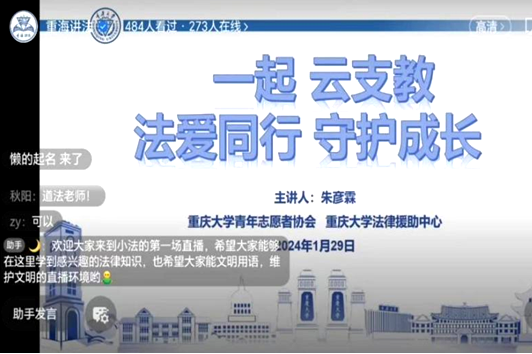 2024年1月29日,金沙js5588“‘援’梦新时代——百子返乡‘枫’华正茂”实践团以重海讲法平台为媒介,以“法爱同行 守护成长”为主题,携手金沙js5588青年志愿者协会和员工法律援助中心共同举办“一起云支教”公益普法直播活动,通过网络向西藏昌都、云南绿春等地的2000多名青少年传递法律知识。本次活动由金沙js55882023级法学硕士朱彦霖担任主讲人,她同时也是金沙js5588第24届研究生支教团成员。