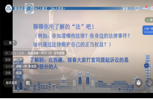 在直播中,为了让青少年们更好地吸收晦涩的法律知识,朱彦霖结合他们生活中的热点法律问题进行讲解,如在寒暑假兼职中怎样保护自己的权益、打游戏充值是否可以返还等。观看直播的青少年们兴致高涨,纷纷提出自己感兴趣的法律问题:“怎样成为一名律师?”“购物时买到假货怎么办?”