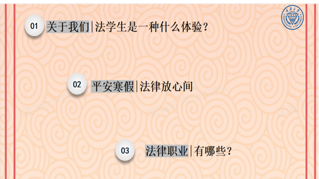 (图1:实践团成员王鹏森从法员工的生活、平安寒假、法律职业三个方面展开)