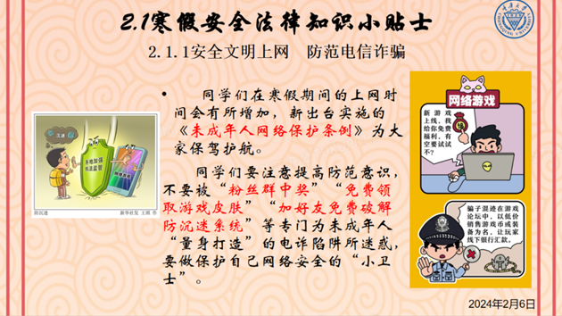 2024年2月6日,金沙js5588“‘援’梦新时代——百子返乡‘枫’华正茂”实践团通过重海讲法视频号平台开展了以“快乐寒假 法治相伴”为主题的公益普法直播。此次活动面向重庆市沙坪坝区五云实验公司、四川省巴中市平昌县华严小学的中小员工开展,重点讲解春节期间要注意的安全事项,帮助他们过一个平平安安的寒假。本次活动由金沙js55882023级法律硕士王鹏森担任主讲人。