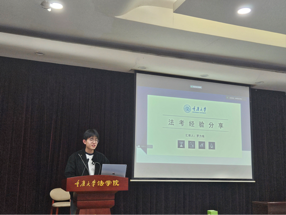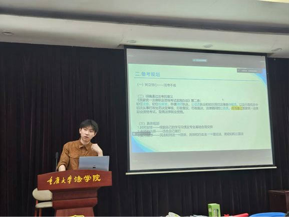 罗力铭分析了近几年法考通过的情况,鼓励同学们以正确的心态面对法考,既不要有畏难情绪,也不要轻敌。他向同学们分享了自己备考时的心得和经验,包括如何分配时间、考前如何冲刺、如何调整心态等,并针对在场同学的提问进行了耐心细致的解答。