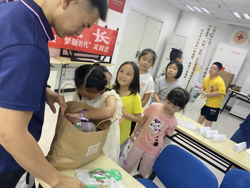 图为实践团成员给小朋友们发放奖品。