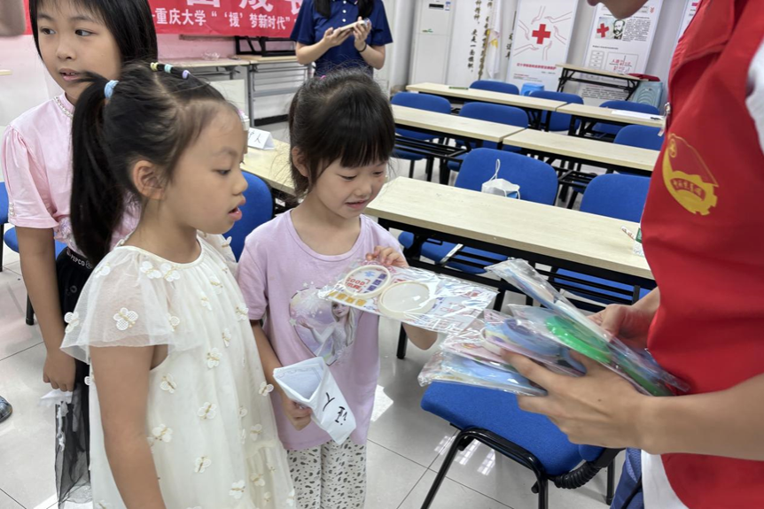 图为实践团成员分发奖品。通讯员 陈睿 悲辰冰 摄