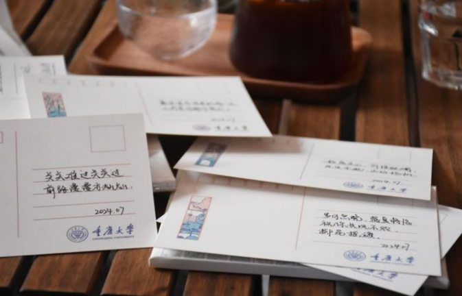 图为实践团成员给同学们送去祝福明信片(通讯员 楚山、谢烃 摄)