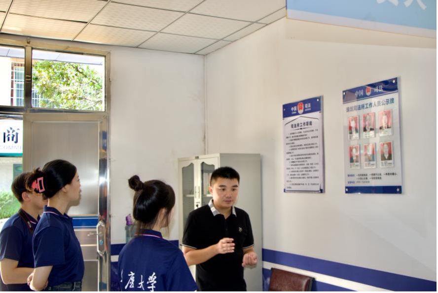 实践团成员在珠坑乡司法所所长于继邦的带领下参观司法所,对司法所的工作职能有了更深刻的了解。讲解过程中,于继邦重点介绍了村内深入推进的“法律明白人”培养工程。作为基层依法治理的“生力军”,“法律明白人”能够发挥人熟、地熟、事熟的优势,引导居民理性表达利益诉求,及时就地化解纠纷。