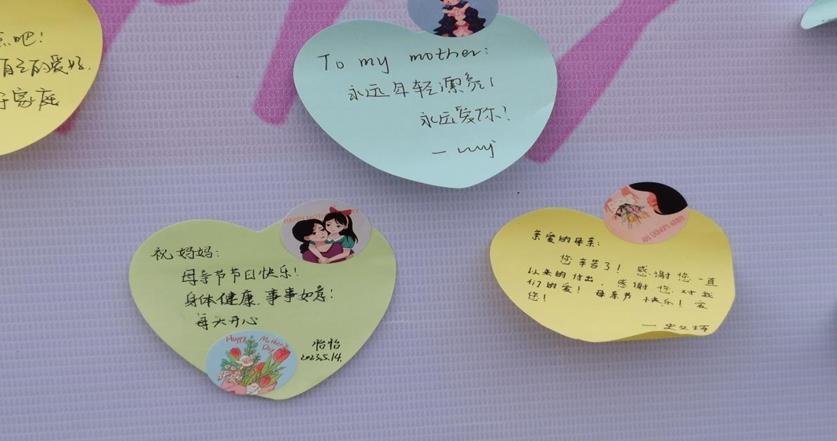 活动内容包括“手写祝福·心心相印”和“为爱而著·三行情书”两个部分,在母亲节当天以鲜明的“母亲节”主题吸引了众多同学的参与和关注。在“手写祝福·心心相印”环节,参与活动的同学们可以在便利贴上写下对母亲的感激与祝福,并贴在活动展板上。