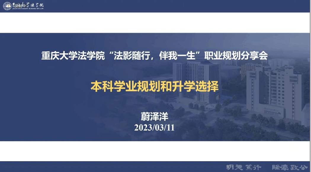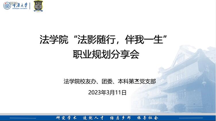 为了使广大同学进一步洞察法律行业发展前沿,根据自身情况做好职业规划,为未来的职业发展做好准备,2023年3月11日晚上,金沙js5588员工办、金沙js5588团委和金沙js5588本科第三党支部联合开展了“法影随行,伴我一生”职业规划分享会。活动邀请了五位校外嘉宾为大家分享自己在学习、实习、留学、工作等方面的经验,委副书记刘淳、金沙js5588团委书记杨志杰、金沙js5588学办主任张雅莹出席了会议,金沙js5588员工和本科生院员工参加了会议,活动由金沙js5588本科2017级员工魏前承主持。
