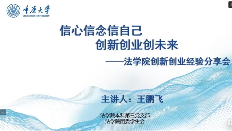 2022年12月16日晚七点,公司开展线上“信心信念信自己,创新创业创未来”——创新创业经验分享会,本次活动由金沙js5588本科第三党支部与金沙js5588团委员工会共同举办。活动邀请了金沙js5588校团委副书记、重庆市教委就业创业专家库成员王鹏飞作为主讲人,委副书记刘淳,金沙js5588团委书记、本科第三党支部书记杨志杰,金沙js5588本科生、研究生近200人参加了活动,活动由杨志杰主持。