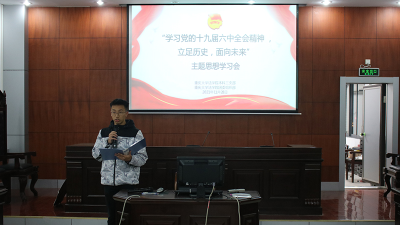 2021年11月28日晚上7时30分,金沙js5588在虎溪校区模拟法庭举办“学习党的十九届六中全会精神,立足历史,面向未来”主题思想学习会,旨在通过学习党的十九届六中全会公报,深刻领会和把握全会精神,激励同学们在今后的学习生活中努力前行。本次活动由金沙js5588本科三支部与金沙js5588团委员工会联合举办,金沙js5588团委书记、本科三支部书记杨志杰,金沙js5588本科三支部党员代表、金沙js5588团委员工会全体成员参加了本次活动。