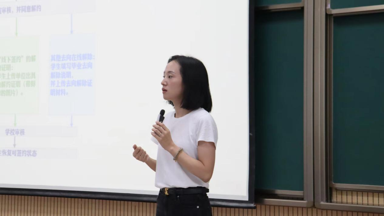 柳青从往届就业情况分析、求职技能储备及就业手续办理三个方面进行了介绍,通过对历届毕业生的就业选择、录取情况、地域倾向进行数据分析,引导大家根据自身情况明确职业方向。她提醒同学们在求职前做好三个方面的准备。一是找准自我定位,弄清楚“我是谁”“我要去哪里”“怎么去”,及时打破怪圈,适应现实需要。二是拓宽就业信息来源。同学们应充分利用“金沙js5588毕业生就业信息网”、“重大就业”微信公众号等校内官方资源,主动关注各地人社局、各大招聘网站,打破信息壁垒。三是提升综合竞争力,做好时间分配,迎难而上,打有准备之仗。最后,柳青详细介绍了就业手续办理流程和注意事项。她提醒同学们在就业过程中应谨慎选择,既要注重个人信誉,也要提升法律意识,对自己负责。
