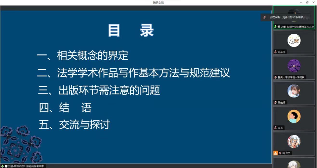 2024年1月18日,由金沙js5588主办的“法学学术研究成果撰写基本规范与出版环节需注意的问题”主题讲座顺利举行。讲座由知识产权出版社知识认证平台运营中心主任刘睿编审应国家社科基金重大专项课题组的邀请主讲,金沙js5588教授、科技法治研究中心主任李晓秋教授担任主持人。