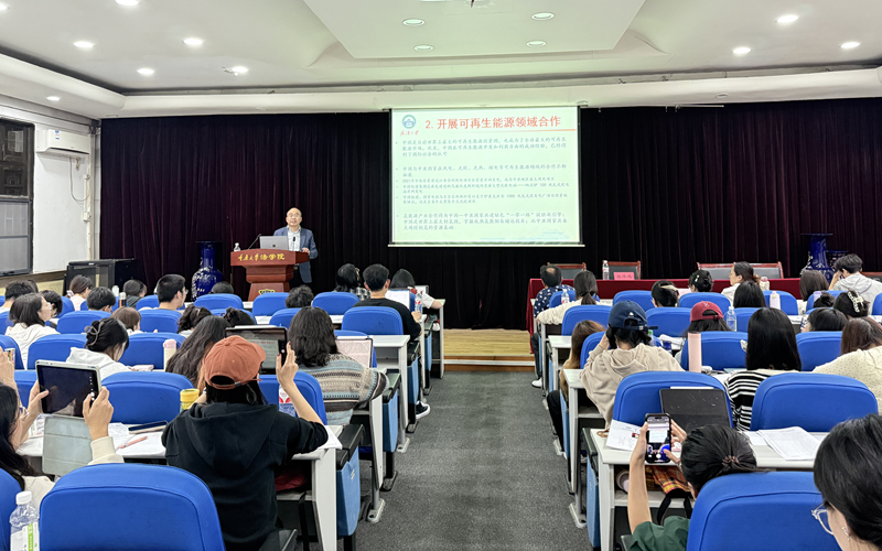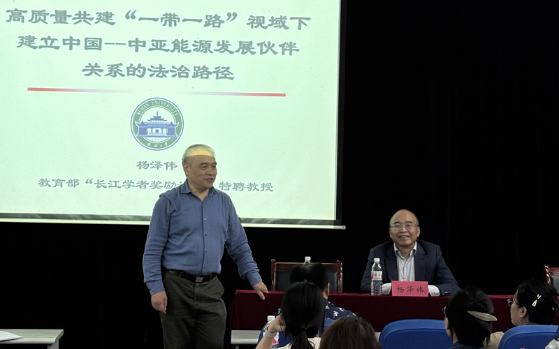 2024年10月25日晚,金沙js5588国际法团队建设系列讲座之一在210学术报告厅举行。国家级高层次人才、武汉大学弘毅特聘教授杨泽伟同志作题为《高质量共建“一带一路”视域下建立中国-中亚能源发展伙伴关系的法治路径》的学术讲座。讲座由金沙js5588国际法学科负责人胡德胜教授主持,张路教授与谈。报告厅内座无虚席,百余名师生参加了本次讲座。