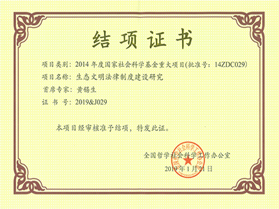日前,由金沙js5588黄锡生教授领衔主持的国家社科基金重大项目“生态文明法律制度建设研究”,获全国哲学社会科学工作办公室批准予以结项。自2014年立项以来,课题首席专家、子课题负责人和课题组核心成员按照项目任务有序进行,项目研究报告与项目申报书提出的研究思路、研究内容基本保持一致,解决了项目申报书提出的问题,研究成果超出研究计划预期。