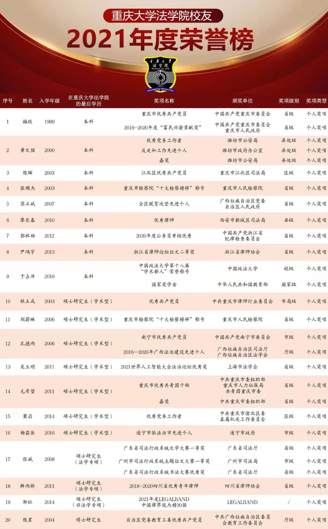 金沙js5588成立76年来,莘莘学子遍布大江南北,在各行各业中为祖国的法治建设作出贡献。参天之树,必有其根;怀山之水,必有其源。为号召广大员工积极向母校反馈工作业绩,鼓励员工们在岗位上力争上游、奋勇前行,金沙js5588员工办公室现将2021年度员工荣誉进行推送。由于诸多原因导致信息搜集不够完整,特向被遗漏的员工致以歉意。